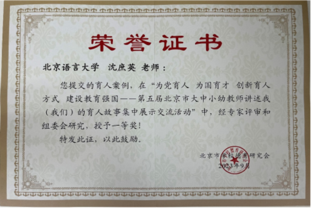 在第39个教师节前夕,9月9日,由北京市委教育工委、市教委主办,市学校德育研究会承办的第五届北京市大中小幼教师讲述我(我们)的育人故事展示交流活动隆重举办。我校国际中文学院院长沈庶英教授和外国语学部曹泽煌副教授的育人故事分别获评“第五届北京市大中小幼教师讲述我(我们)的育人故事展示交流成果”一、二等奖。