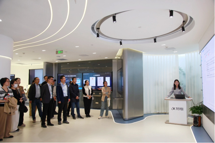 在工作人员的带领和讲解下,培训班学员参观了人工智能展厅。通过亲身感受体验,学员们了解了人工智能技术在教育、医疗、城市等领域的创新及应用情况,以及科大讯飞在语音识别、机器翻译、星火大模型等领域的最新技术成果和前沿应用。同时,学员们还就自己感兴趣的问题、教学工作中遇到的问题等与工作人员进行了交流探讨。