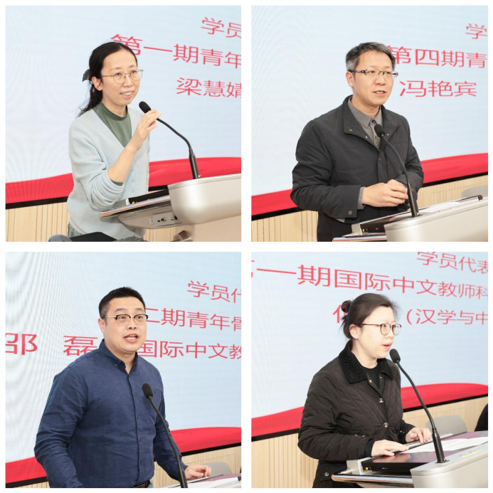 本期培训班三位学员代表作了表态发言。第四期青年拔尖人才研修班学员代表、信息科学学院冯艳宾副教授从端正研修态度、坚定努力方向与成为时代新人等三个方面表明了学习态度和决心。第二期青年骨干教师培训班班长、国际中文教育实践与研究基地邵磊老师从行政与教学的交往、知识与技能的交流、党性与业务的交融等三个方面讲述了培训班的意义,并表示要以“空杯心态”“问题导向”“共同体意识”参加培训,提升能力。第一期国际中文教师科研能力提升培训班学员代表、汉学与中国学学院何洁老师围绕“立足需求、凝聚力量”“知行合一、主动破局”“期待花开、共赴未来”谈到了对此次培训的理解和期待,并表示在培训中要努力做到主动吸收、主动扎根、主动链接。