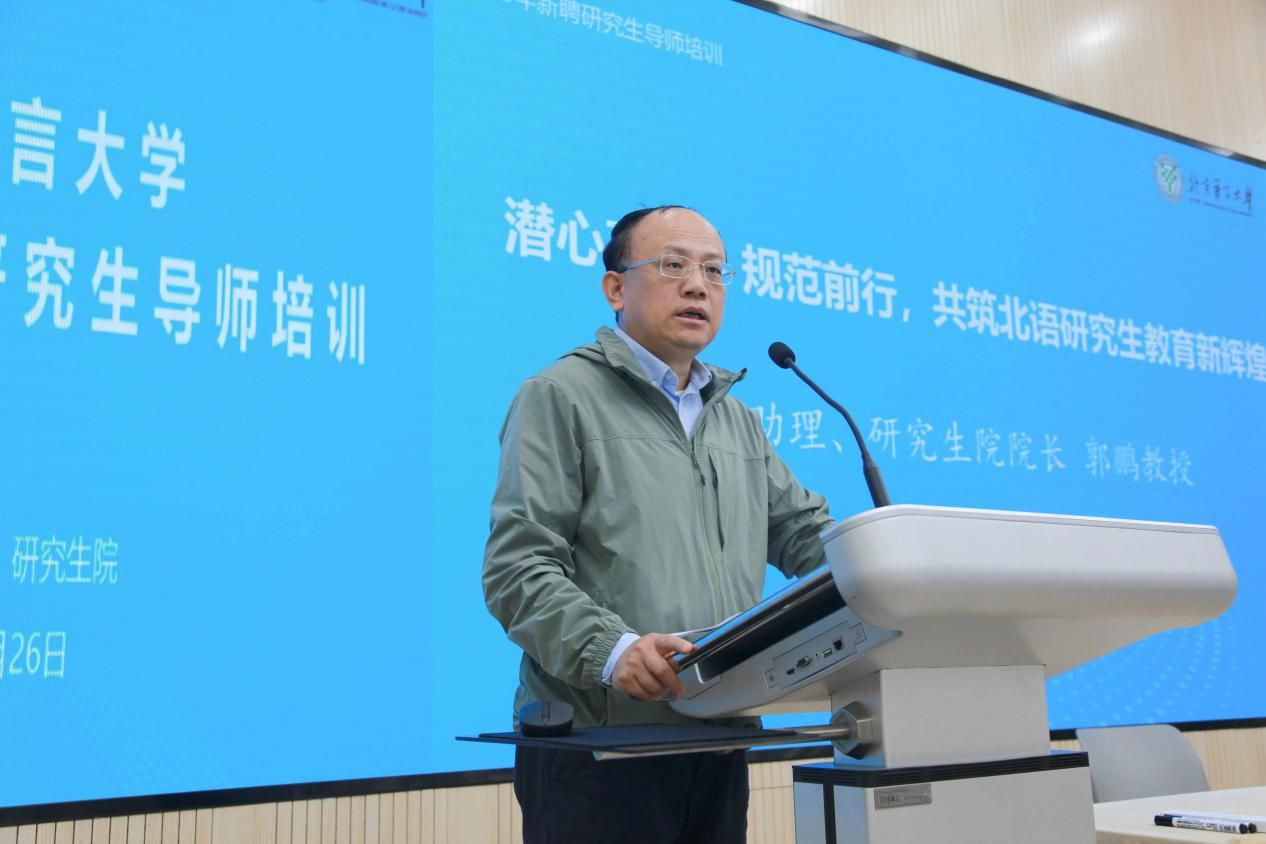 校长助理、研究生院院长郭鹏教授以“潜心育人,规范前行,共筑北语研究生教育新辉煌”为题介绍了学校研究生教育发展基本情况和导师职责,并分享了自己作为一名导师的经验体会。他强调,建设高素质导师队伍是学校研究生教育发展的基础性工作,目前学校导师队伍整体水平较高,但也存在个别导师指导不科学、精力投入不足等问题。结合《教育强国建设规划纲要(2024—2035年)》要求及学校研究生规模增长实际,他提出四点要求:一是将政治素质放在首位,坚持立德树人;二是增强导师岗位意识,全方位提升育人能力;三是深化管理机制体制改革,建立导师招生资格年审和动态调整制度,完善分类评价考核;四是加强师德师风建设,为人师表、以德育人。他倡导全体导师以爱心、耐心和责任心投入工作,共同捍卫北语研究生导师荣誉,为学校“双一流”建设及国家高层次人才培养贡献力量。